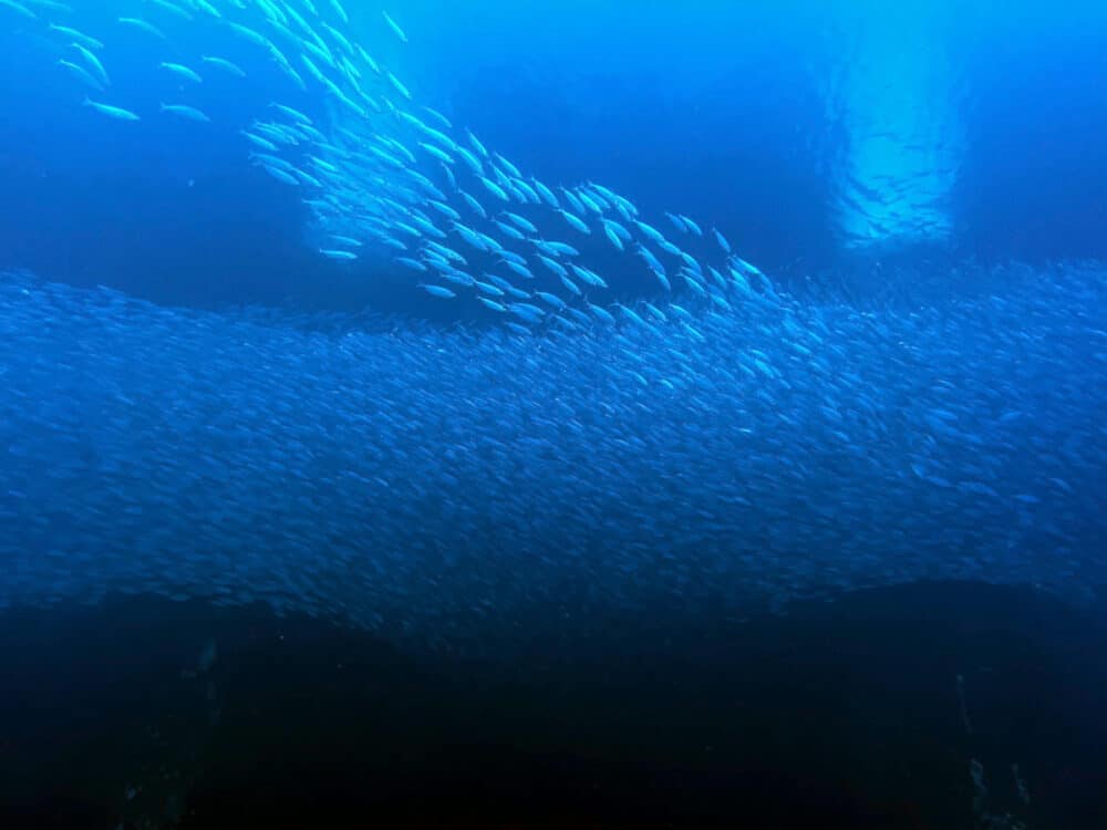 台風から変わった低気圧の影響で 風も強く、天気も時折雨が降っていました 今日は本部から3ボート まずは、ゴリラチョップへ いや~ボートだと泳がなくて凄い楽ちん♪ ちょっと進むだけで、ミズンの群れです ジョーフィッシュやセ