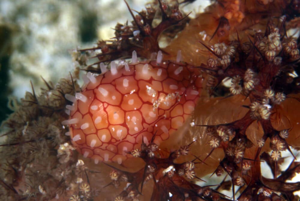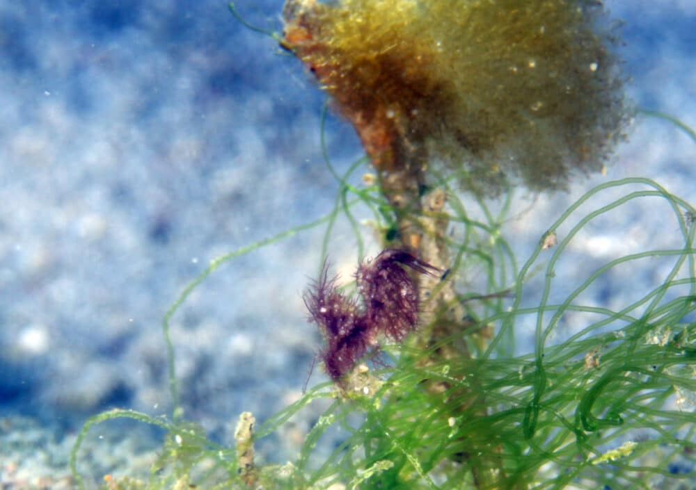 橋脚に着くと、落ちているトゲトサカにムラクモコダマウサギが付いています