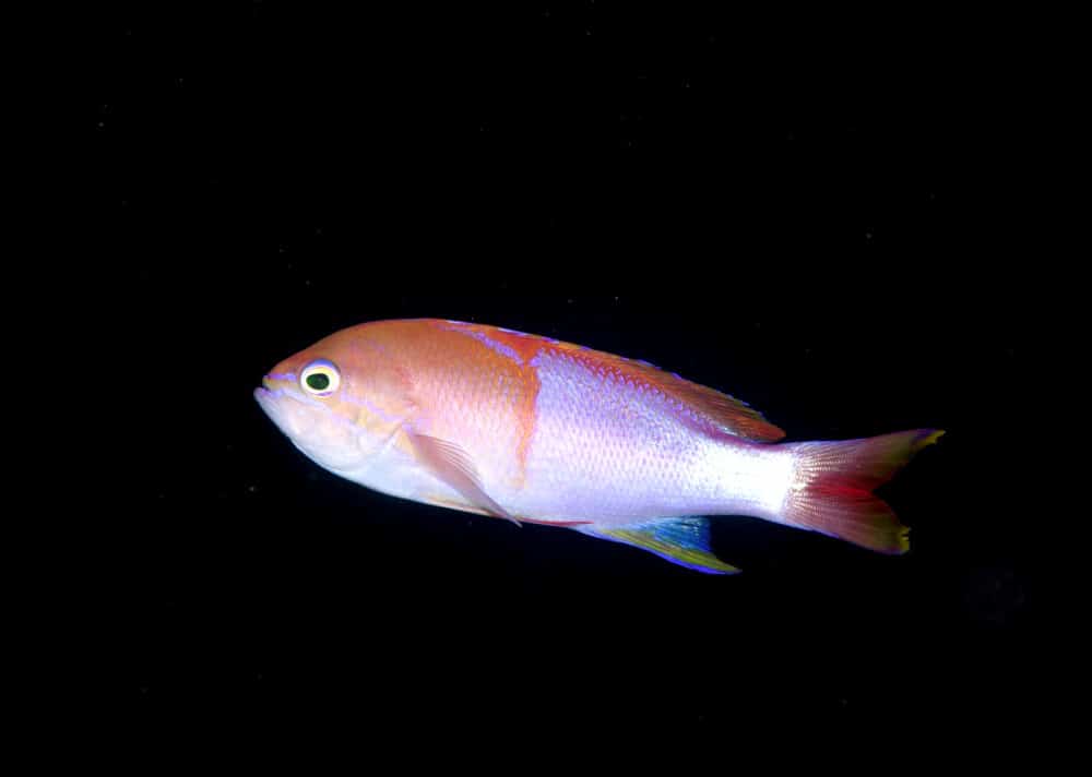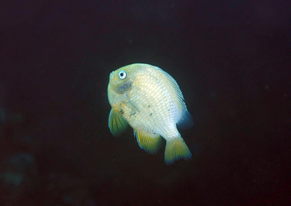 スジクロユリハゼを見て上がって行くと、今日もこの白いミツボシクロスズメダイが目に入りました